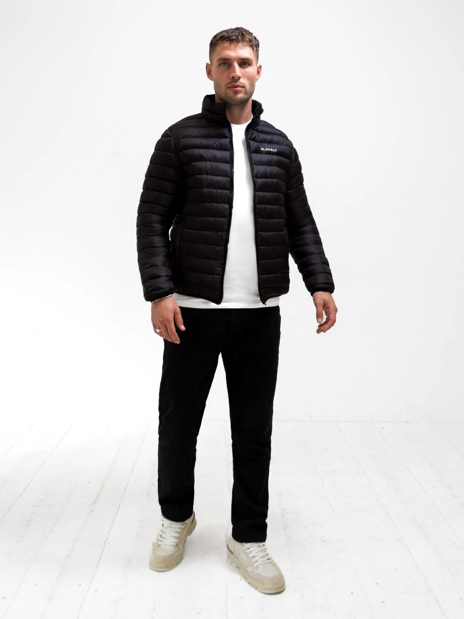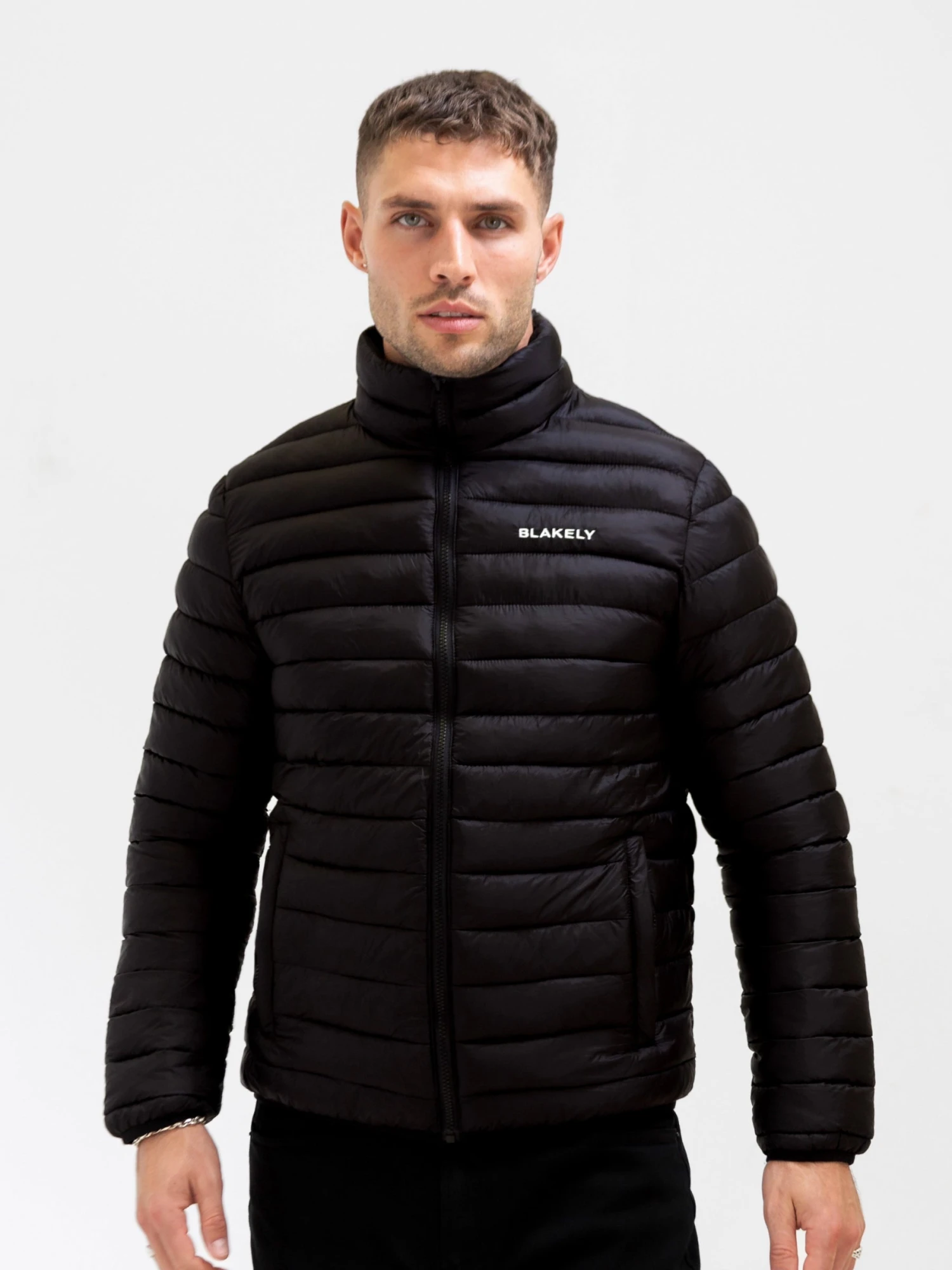 Introducing the Lucas Lightweight Puffer Jacket in black. This jacket features a clean, streamlined design with subtle quilted detailing. It is a thinner puffer that features Blakely branding on the chest. Additional features include a full zip closure, two front pockets, and a mock neckline for added warmth without the bulk.
