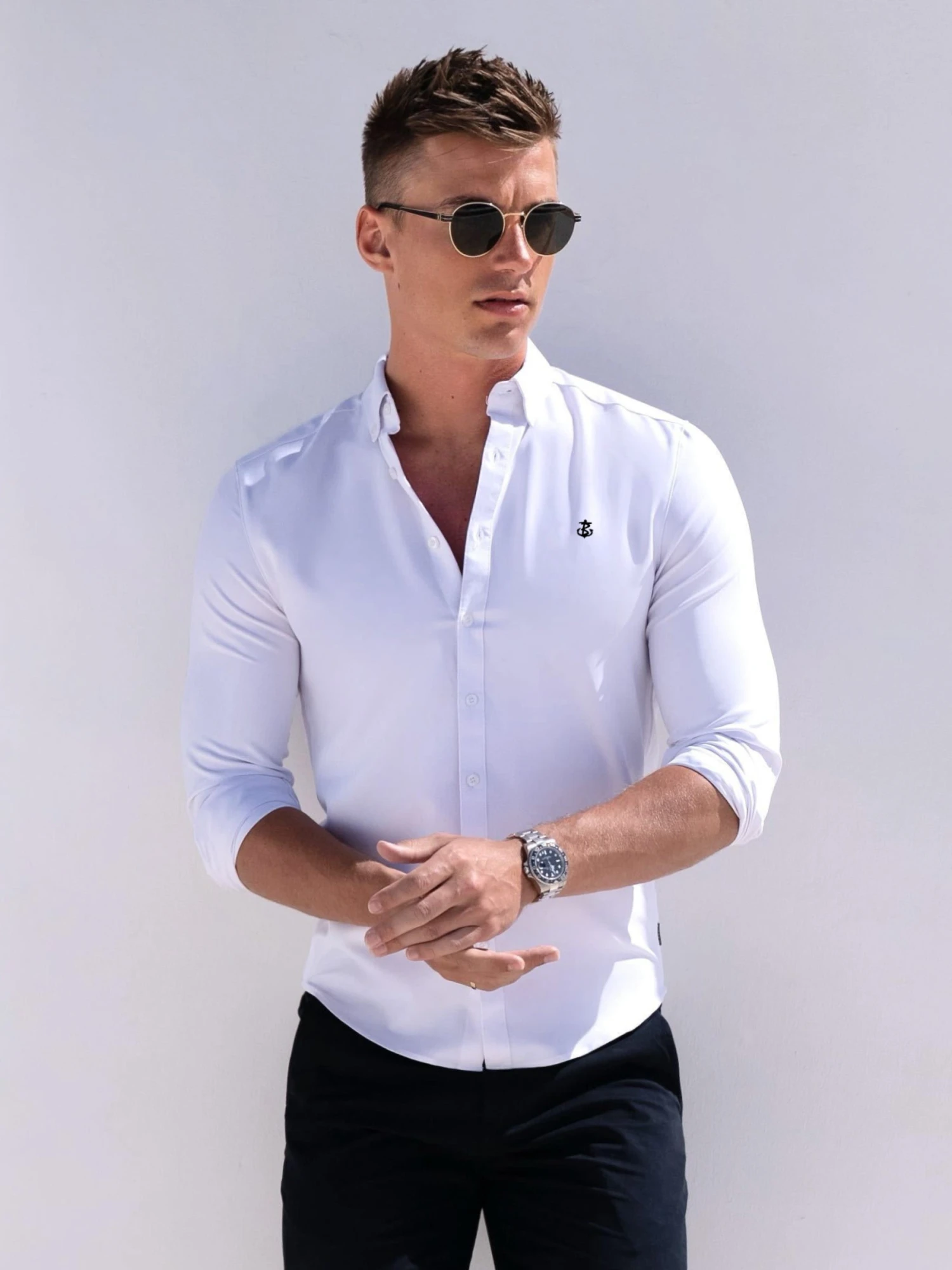 This slim-fit essential is crafted from premium stretch fabric for all-day comfort and a tailored silhouette. It features a classic summary-down collar, long cuffed sleeves, and a curved hem for a sharp, modern finish. The look is elevated with an embroidered anchor logo on the left chest — a subtle nod to refined style.
