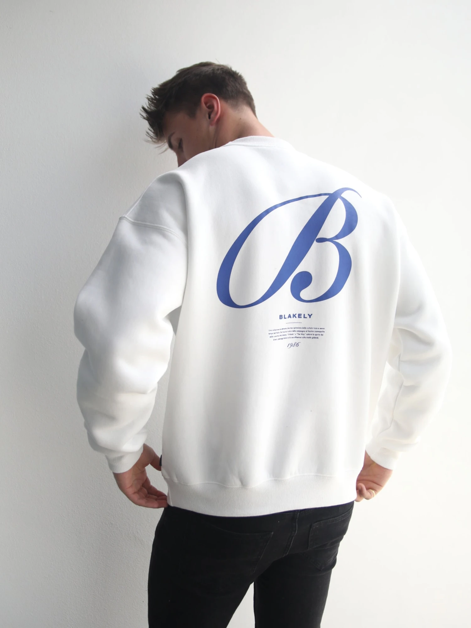 The Vita Jumper in flat white is crafted from a cotton blend with a relaxed fit. It has a ribbed hem and cuffs and is finished with a large graphic print in cobalt on the back & front.